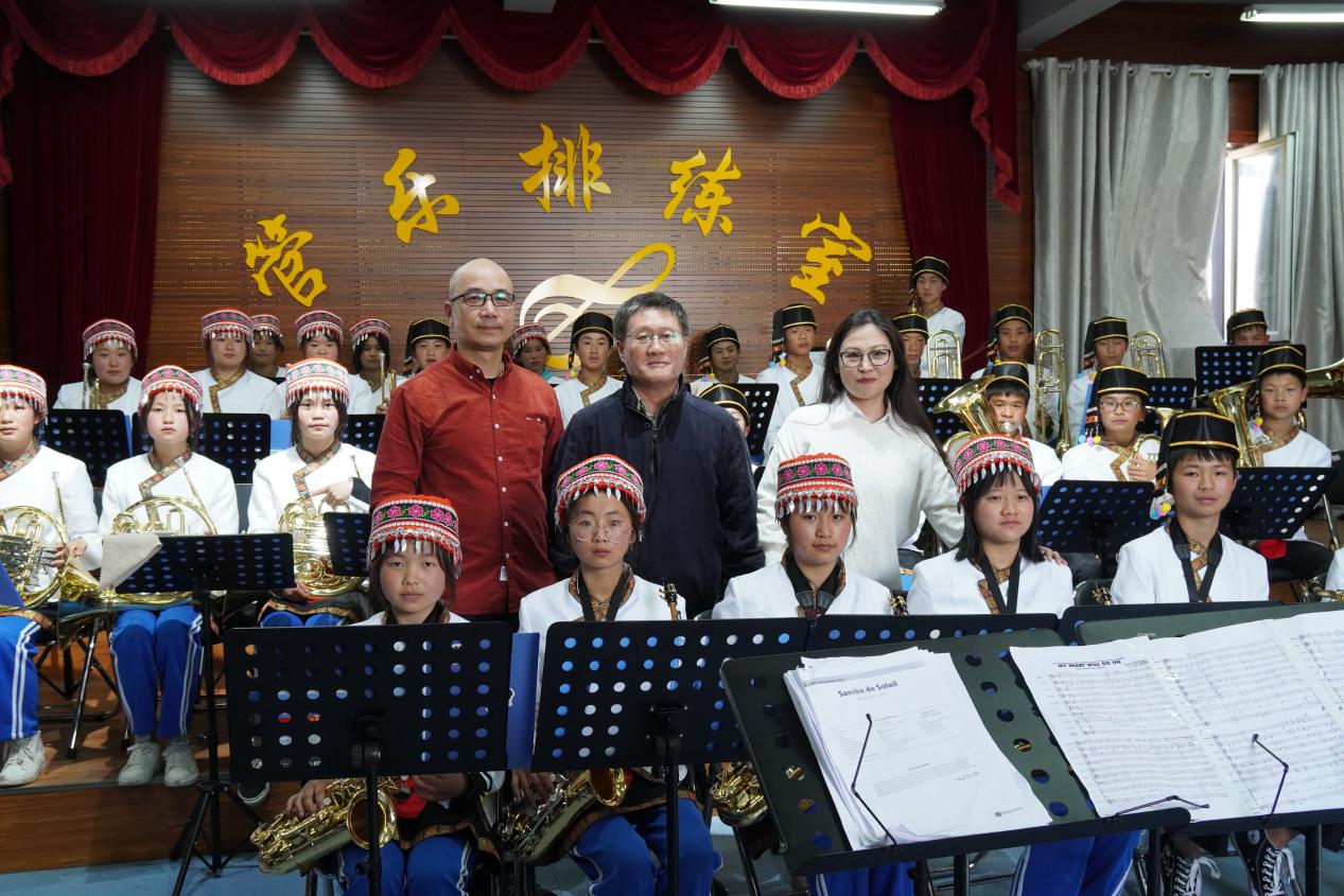 (调研团与管乐队学生在一起)